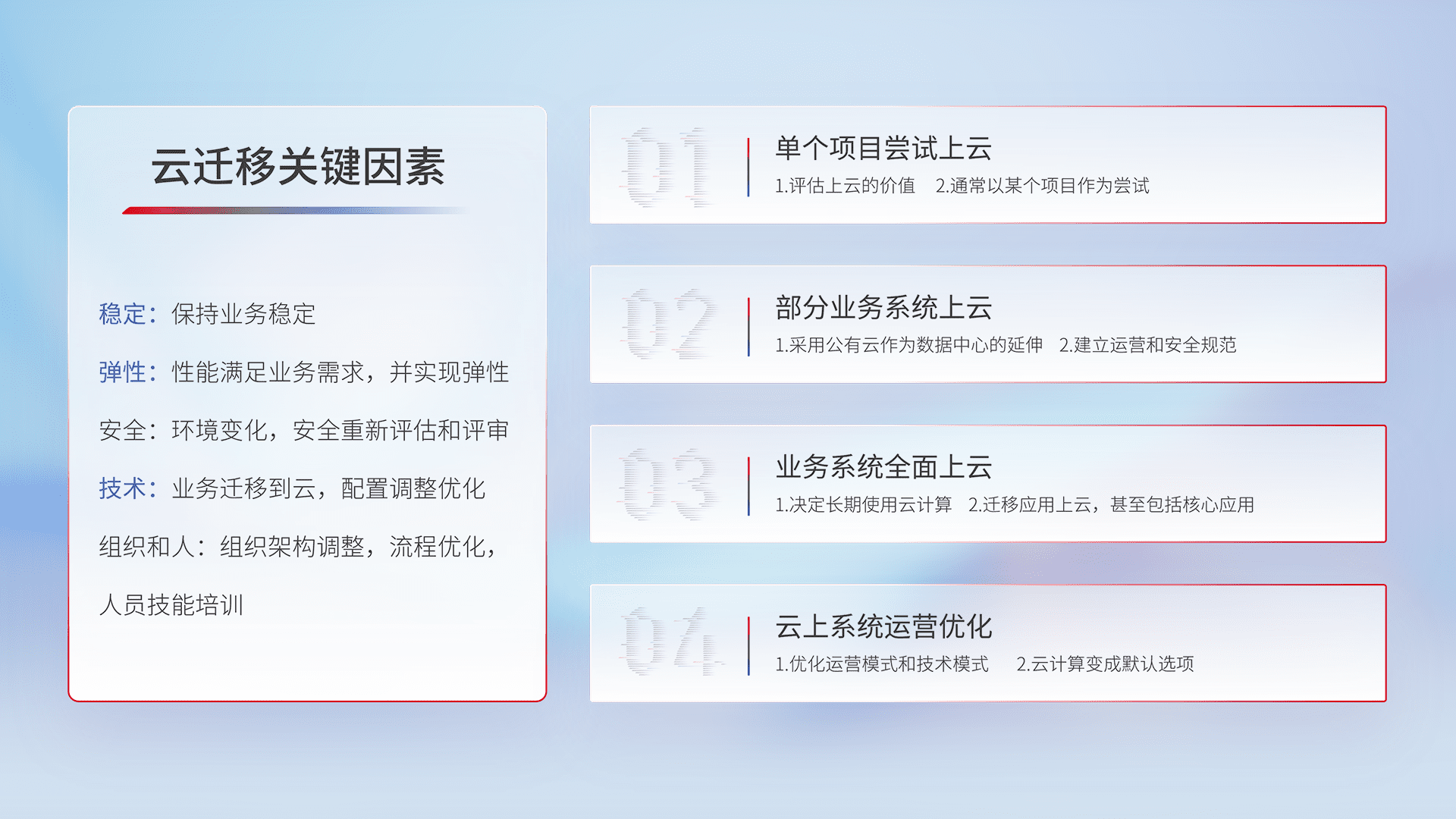 结合实际业务,,,,从规划设计、、、、云平台选型、、云原生改造、、数据迁移、、集成交付,,,,迁移全过程为客户识别最佳上云路径,,,做好风险识别管理,,设计网络架构、、、身份权限、、、、安全审计合规、、、操作审计、、、、日志审计、、监控告警策略、、、多站点容灾设计等,,对云上基础设施进行整体规划,,,提升IT治理水平,,,以满足弹性、、、高可用、、、、高性能的需求。。。。
