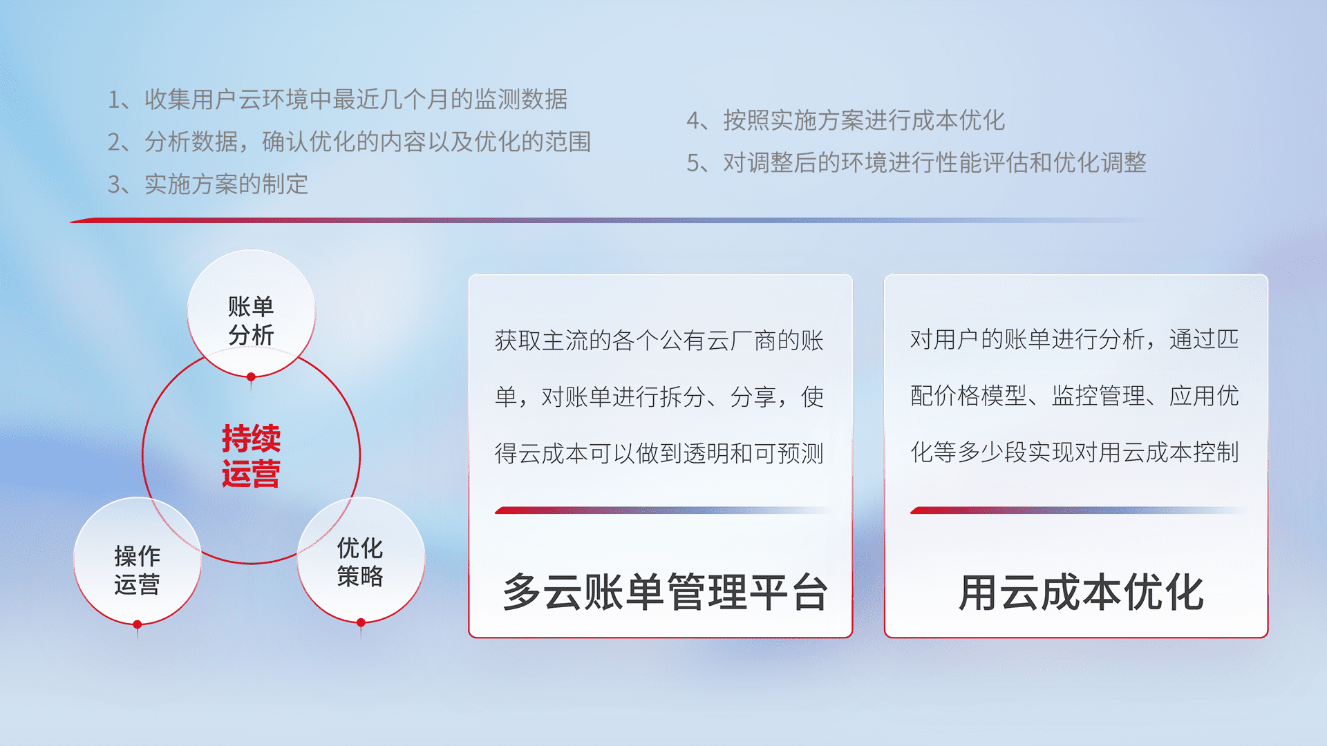 通过多云纳管,,,以统一的资源数据模型把客户的云资源进行抽象和封装,,,,进而实现对多云资源的统一操作,,,,保障云资源管理的可靠性、、、稳定性与可用性。。。。量身定制化运维内容,,,,配置、、开发运维、、、补丁管理、、、备份、、监控、、、、认证和访问管理、、审计和日常巡检等,,,,保障在用云过程中的可靠度,,,稳定度以及高可用率。。。