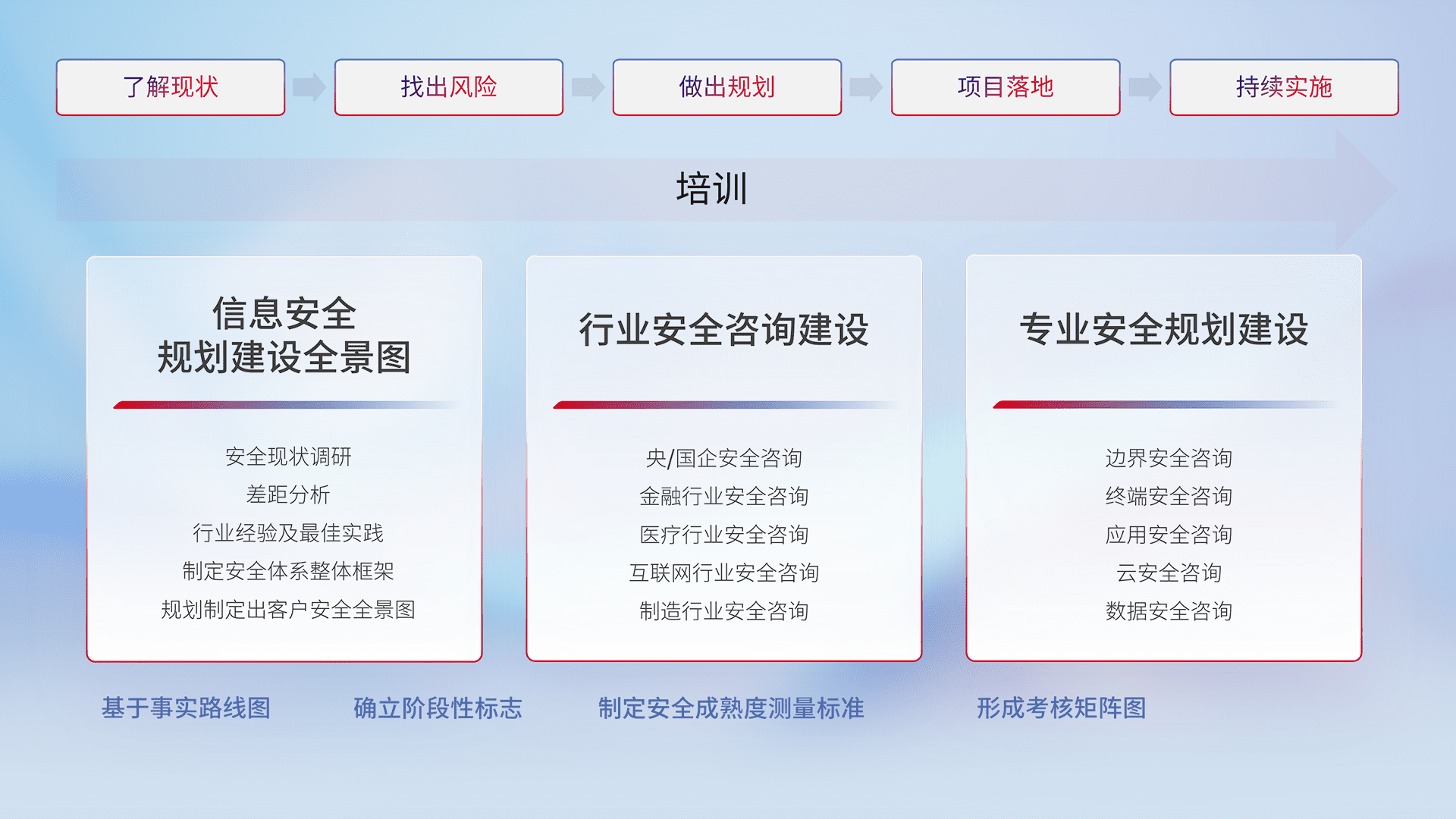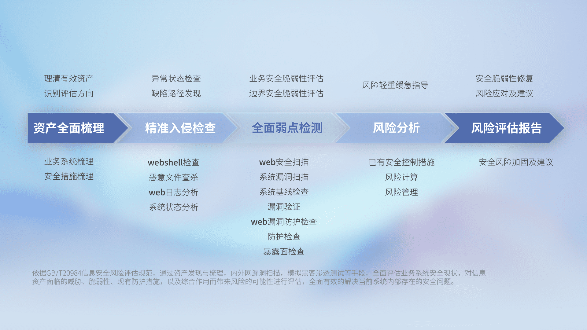 针对客户行业特性,,以专业的安全服务+多厂商联合解决方案提供专属的一站式安全管理服务,,帮助客户全面感知网络空间威胁,,基于识别、、检测、、、、分析、、防护、、监测、、响应的服务理论模型,,从方案咨询、、集成交付、、、、评估验证、、、优化加固、、、运维运营,,,,致力于为客户提供完整的闭环管理式安全服务。。。。以实战经验为客户打造高抵御风险的安全体系,,帮助客户发现威胁、、对抗威胁、、、处置威胁,,,,不断积累安全对抗能力,,持续保障数字化安全。。。。
